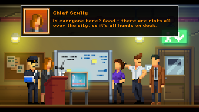 Graphically The Darkside Detective is formed from very chunky pixel art. The art is crisp and clear, so it doesn't really look half bad. While it is a point and click game, the characters themselves don't move on the screen. McQueen and Dooley stand on one spot of the screen while you point and click everything you see worth pointing and clicking at. you can also use items on chunky pixels on screen as well as use chunkily pixelated inventory items on other inventory items. So it's a pretty standard fare as far point and click games go.